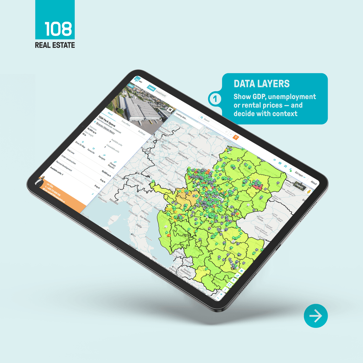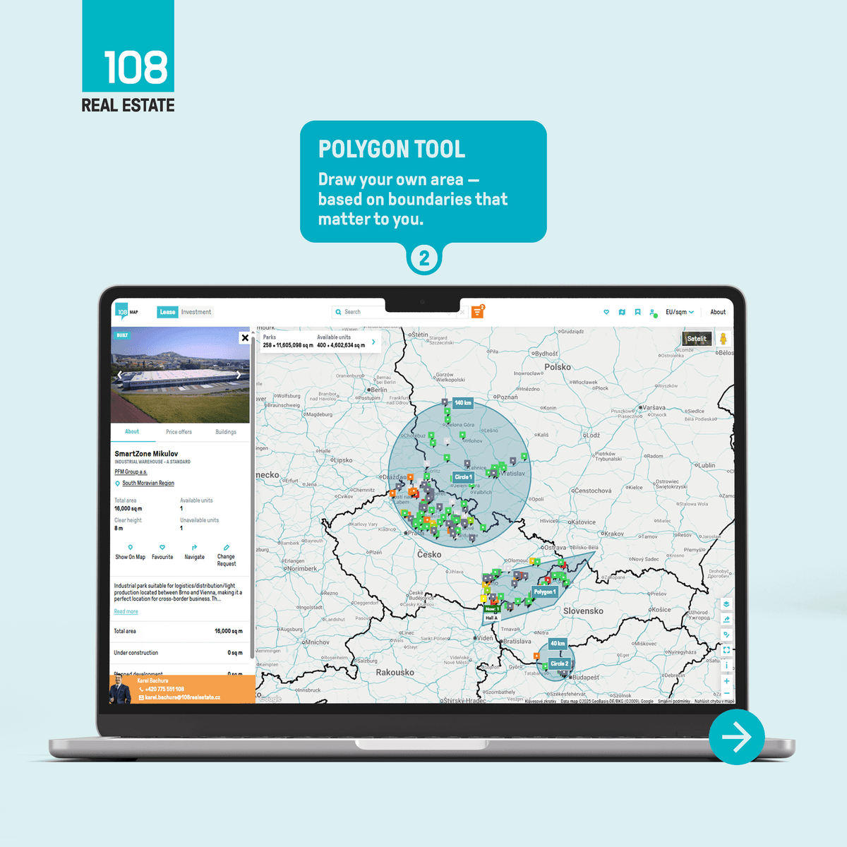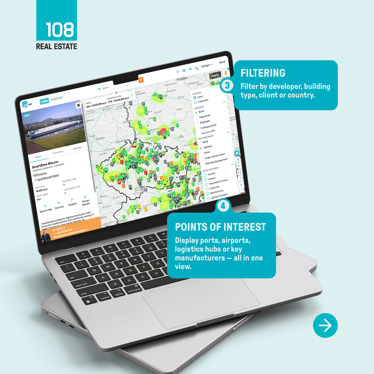 Not all maps are created equal. While some only show dots on a page, our brand-new 108Map delivers context, detail, and real estate logic. It gives you a comprehensive view of the industrial property market, helping you find the right solution for your business – whether it’s an industrial space for lease, a warehouse unit, or a logistics hall.